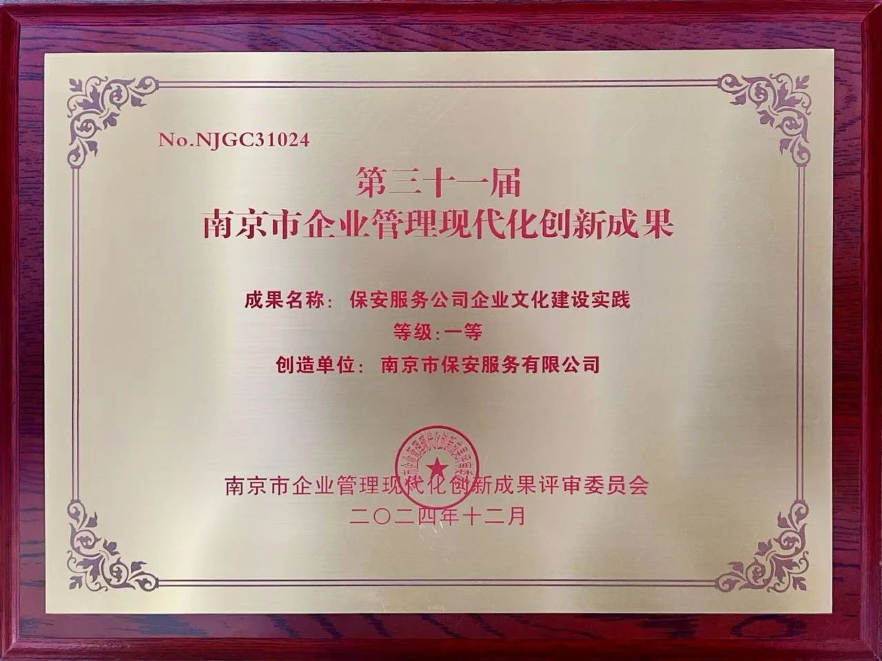 喜報(bào)!南京市保安服務(wù)有限公司榮獲第31屆南京市企業(yè)管理現(xiàn)代化創(chuàng)新成果一等獎